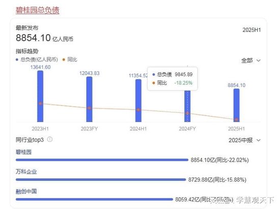 在“保交楼”和“卖卖卖”模式的双重推动下,碧桂园债务总额数据虽然在“大幅下降”,由2024年上半年的1.14万亿下降至2025年上半年的8854.1亿元。但在净资产“显著下降”和现金“接近枯竭”的情况下,碧桂园已到“生死边缘”。