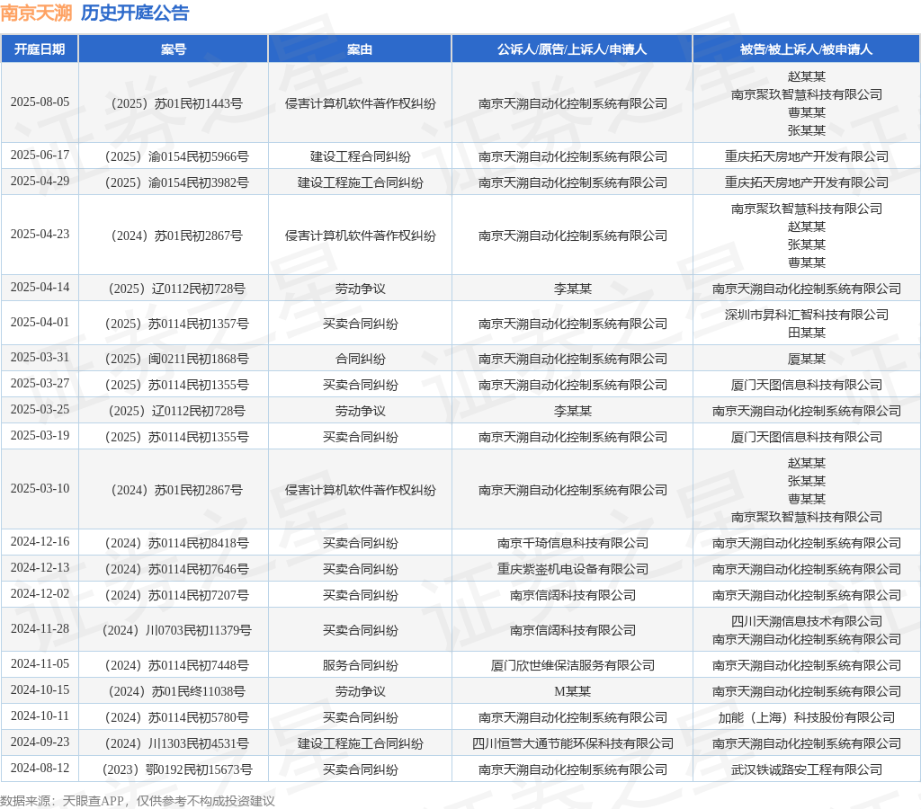 案号:(2025)渝0154民初5966号审理法院:重庆市开州区人民法院案由:建设工程合同纠纷当事人信息: 原告/上诉人:南京天溯自动化控制系统有限公司 被告/被上诉人:重庆拓天房地产开发有限公司开庭日期:2025年6月17日根据统计,近一年内以南京天溯自动化控制系统有限公司为当事人的历史开庭公告有20则,其中案由为“买卖合同纠纷”的公告以9则居首,其次为“侵害计算机软件著作权纠纷”有3则,“劳动争议”有3则。历史开庭公告如下: