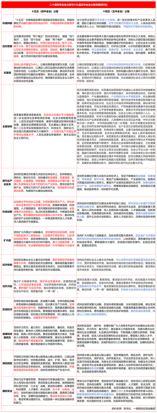 对比二十届四中全会与十九届五中全会公报内容,最直观的感受是,“十五五”整体的政策基调与应对思路相比“十四五”更加积极主动。公报指出:“十五五”时期我国发展环境面临深刻复杂变化,我国发展处于战略机遇和风险挑战并存、不确定难预料因素增多的时期。比如,地缘政治局势更加复杂多变,“逆全球化”趋势日益明显。我国科技创新实力虽取得长足进步,但在一些前沿领域仍面临“卡脖子”现象。房地产市场调整带来的债务和需求不足问题依然有待解决,扩大有效需求、摆脱物价低迷状况的紧迫性上升。为应对这些挑战,继2022年二十大报告后,四中全会再提“坚持以经济建设为中心”,叠加“续写经济快速发展和社会长期稳定两大奇迹新篇章”的表述,表明经济增长重要性提升。“积极识变应变求变,敢于斗争、善于斗争,勇于面对风高浪急甚至惊涛骇浪的重大考验,以历史主动精神克难关、战风险、迎挑战”相比“树立底线思维,准确识变、科学应变、主动求变”的应对思路,彰显了政策的自信从容,决心的显著增强和举措的积极有为。未来我国政策或将在一系列领域主动出击,有利于提振市场信心和风险偏好。