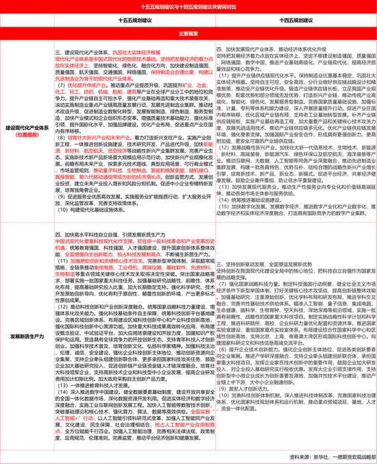 “十五五”规划建议将建设现代化产业体系的顺序前移,放在首要任务位置,强调“保持制造业合理比重,构建以先进制造业为骨干的现代化产业体系”。相比“十四五”规划建议,“十五五”规划建议首次明确指出了现代化产业体系中传统产业的发展方向,提出“巩固提升矿业、冶金、化工、轻工、纺织、机械、船舶、建筑等产业在全球产业分工中的地位和竞争力,提升产业链自主可控水平”,旨在提质升级。与此同时,继续强调培育壮大新兴产业和未来产业,包括“新能源、新材料、航空航天、低空经济”,形成规模化支柱力量。提出前瞻布局未来产业,包括“量子科技、生物制造、氢能和核聚变能、脑机接口、具身智能、第六代移动通信”等产业,成为新的经济增长点。相比于2025年的政府工作报告,新增了氢能和核聚变能、脑机接口这两个方向。