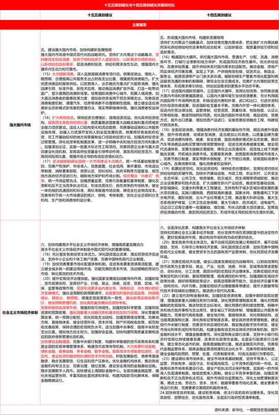 “加快构建高水平社会主义市场经济体制”方面,“十五五”规划建议提出“促进形成更多由内需主导、消费拉动、内生增长的经济发展模式”,进一步夯实了扩内需、促消费的政策方向。在政策定调上更加积极,提出“实施更加积极的宏观政策,持续稳增长、稳就业、稳预期”,“发挥积极财政政策作用”。资本市场方面,“十五五”规划建议提出“加快金融强国建设”,“提高资本市场制度包容性、适应性,健全投资和融资相协调的资本市场功能”。结合新“国九条”,预计“十五五”期间资本市场在支持实体经济尤其是新质生产力发展方面的能力和作用有望进一步提升。