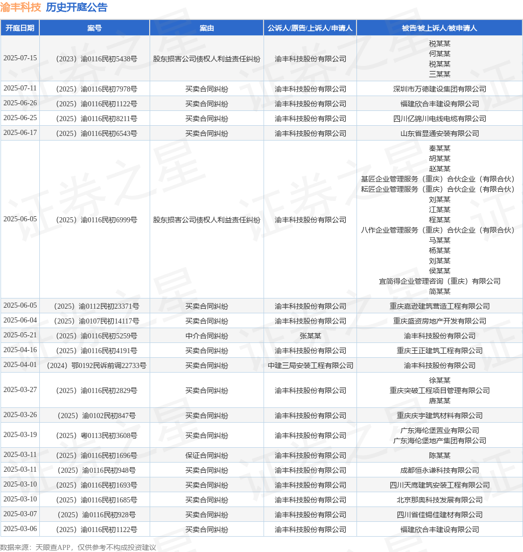 案号:(2025)渝0116民初6543号审理法院:重庆市江津区人民法院案由:买卖合同纠纷当事人信息: 原告/上诉人:渝丰科技股份有限公司 被告/被上诉人:山东省显通安装有限公司开庭日期:2025年6月17日根据统计,近一年内以渝丰科技股份有限公司为当事人的历史开庭公告有77则,其中案由为“买卖合同纠纷”的公告以70则居首,其次为“股东损害公司债权人利益责任纠纷”有2则,“中介合同纠纷”有1则。历史开庭公告(前20条)如下: