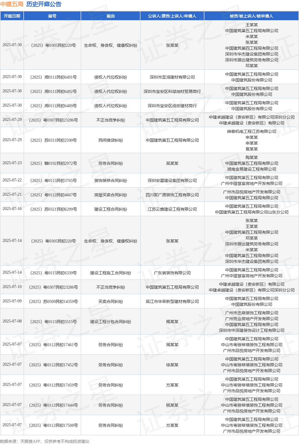 案号:(2025)粤0115民初5515号审理法院:广州市南沙区人民法院案由:建设工程分包合同纠纷当事人信息: 原告/上诉人:揭某某 被告/被上诉人:深圳市中深建装饰设计工程有限公司、广州市忠鼎装饰工程有限公司、中国建筑第五工程局有限公司、广州隽业房地产开发有限公司开庭日期:2025年6月17日根据统计,近一年内以中国建筑第五工程局有限公司为当事人的历史开庭公告有1022则,其中案由为“买卖合同纠纷”的公告以230则居首,其次为“建设工程施工合同纠纷”有155则,“劳务合同纠纷”有117则。历史开庭公告(前20条)如下: