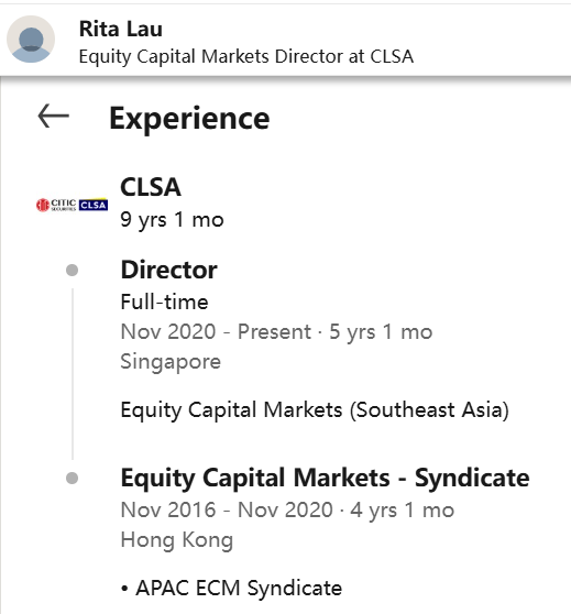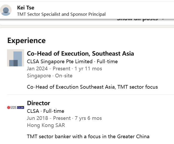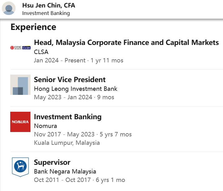领英资料显示,Hsu Jen Chin于2024年1月加入中信里昂,此前曾在丰隆投资银行工作。